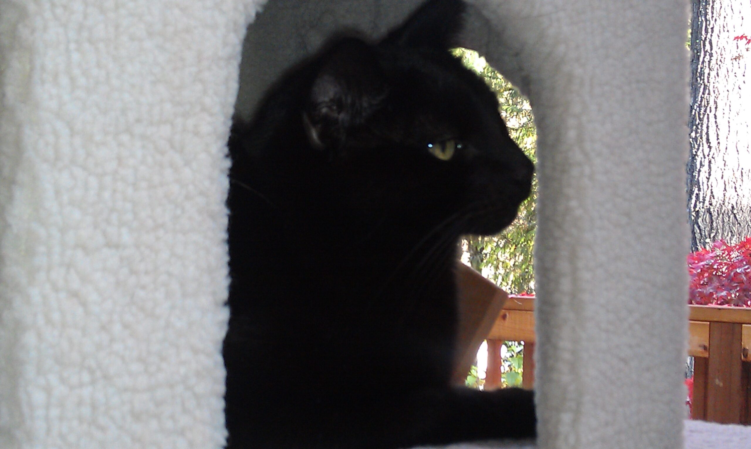 My late wife Mary and I adopted him as a kitten. A Black Bombay, when he stretched out he could reach the countertops with his front paws. He was quite the talker, and very mischievous as a young cat. As he matured and after he lost his older kitty buddies, he settled down and became quite the snuggler. When we moved out to the country, he loved watching the wildlife out of the windows, perched in his tower. He also loved to sit in front of the wood stove and watch the flames, or snuggle up on a rug in front of it. He was always a "heat seaking missile". When we adopted a dog, he wanted nothing to do with it, but eventually the two of them became best friends. He joins Drac, Rani and Lucky over the Rainbow Bridge and is probably snuggling in Mary's lap right now.